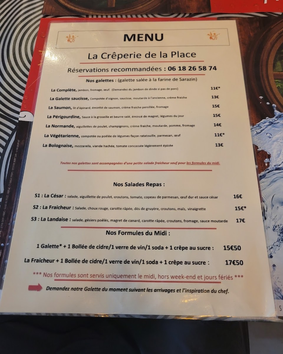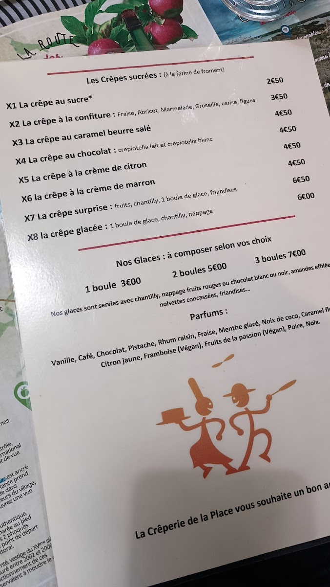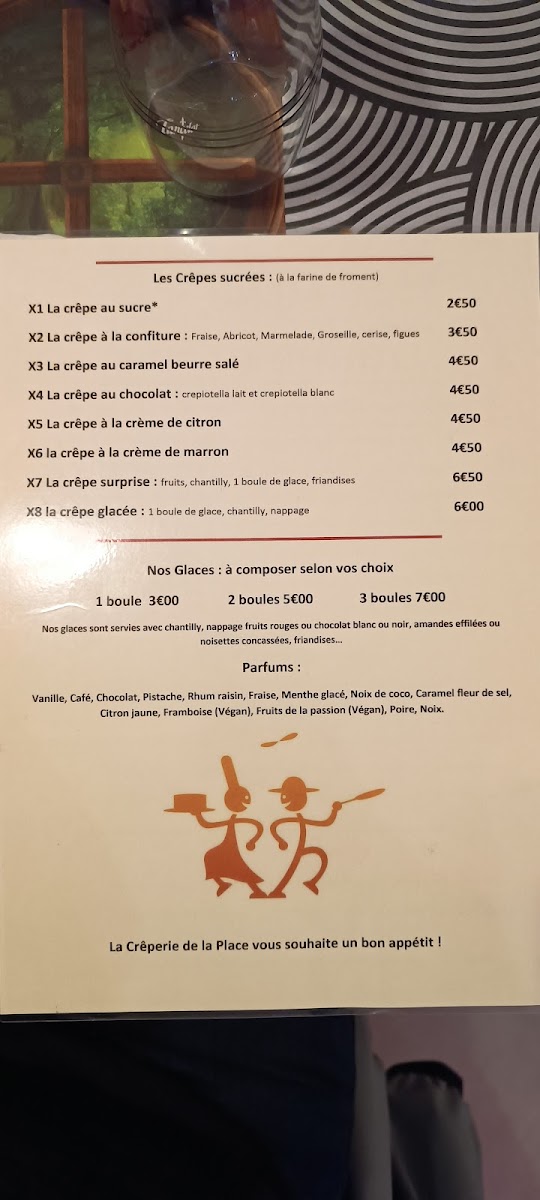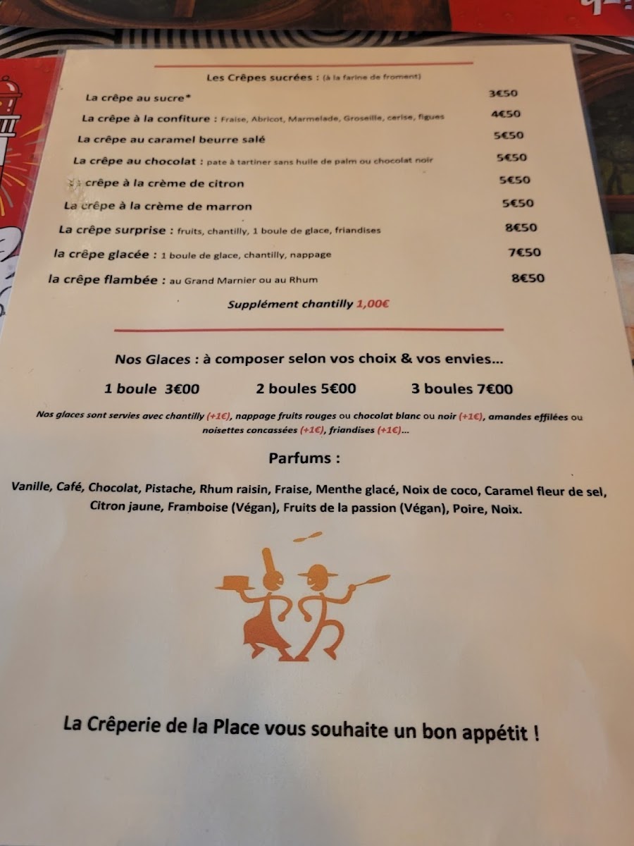 La Crêperie De La Place offers a delightful variety of both savory and sweet options, showcasing the best of traditional French crêpes and galettes. The Galette Noix de Saint Jacques stands out as a perfect choice for seafood lovers, with its tender scallops paired with fresh ingredients for a balanced and flavorful experience. For a refreshing and zesty dessert, the Crepe Au Citron brings a classic lemon crêpe to life with its tangy citrus notes, complemented by a delicate sweetness. Meanwhile, the X8 la Crepe Glacée presents an indulgent dessert, featuring ice cream nestled in a soft crêpe, ideal for those craving a cool treat. The X7 la Crépe Surprise adds an element of surprise, with a creative twist that keeps diners guessing and coming back for more. Each dish at La Crêperie De La Place reflects the restaurant’s commitment to quality ingredients and authentic French preparation, making it a must-visit for anyone in Bagnols-sur-Cèze.